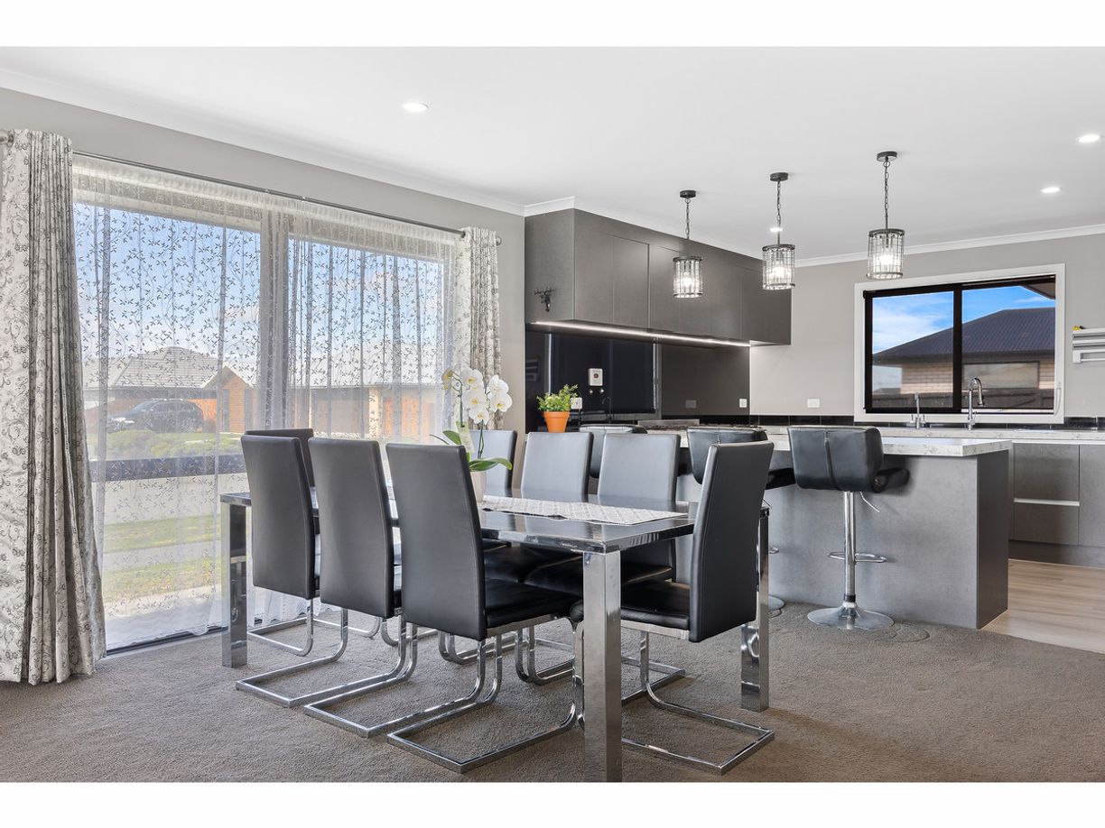 The home includes three well-appointed bedrooms, with the master suite boasting a walk-in wardrobe, ensuite, and direct access to the patio. The additional two bedrooms are positioned together, sharing a beautifully designed family bathroom and separate toilet. Year-round comfort is assured with two heat pumps, and the internal double garage, complete with a laundry, adds extra convenience to your daily life.