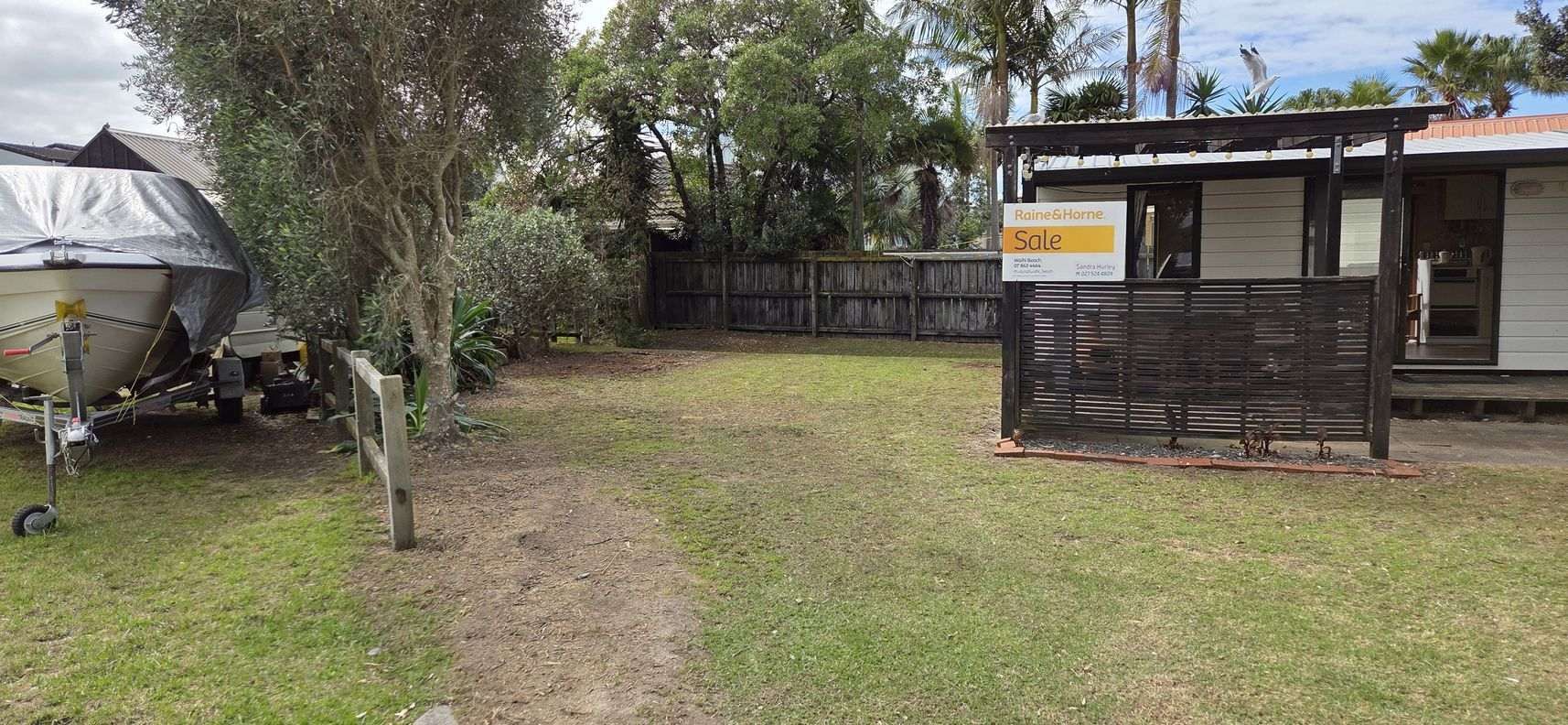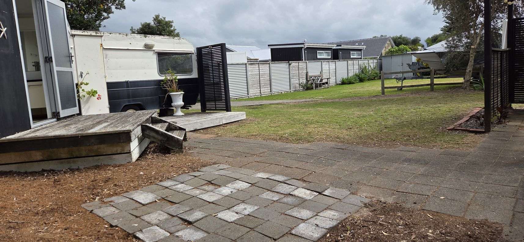 The property features two transportable units, thoughtfully connected to create a cozy two-bedroom tiny home with a comfortable living area and a compact kitchen. A separate "Wendy house" offers additional amenities, including a laundry, bathroom, and an old caravan that could be transformed into a teenage retreat or extra bedroom.