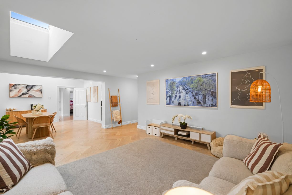Natural light pours into the living area through a skylight, creating a warm and inviting space that flows effortlessly, ideal for entertaining or relaxing with friends and family. Every corner of the home has been thoughtfully enhanced to maximize both comfort and style.
