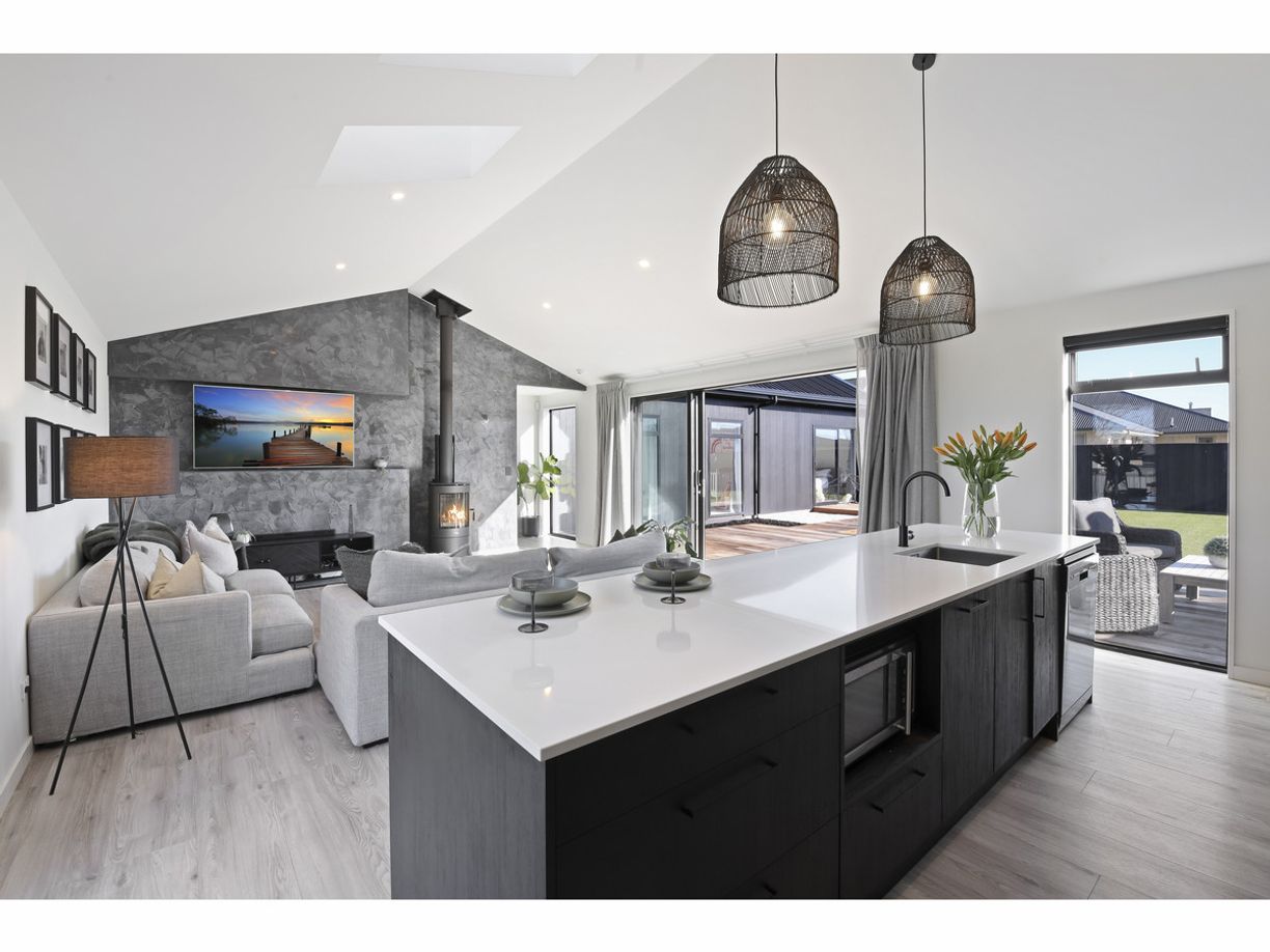 The open-plan kitchen, dining, and living spaces flow seamlessly to the outdoors, featuring a heat pump and modern wood fire for year-round comfort. The kitchen is a culinary enthusiast’s dream, designed for entertaining with ample storage and modern appliances, making it ideal for family meals and larger gatherings.