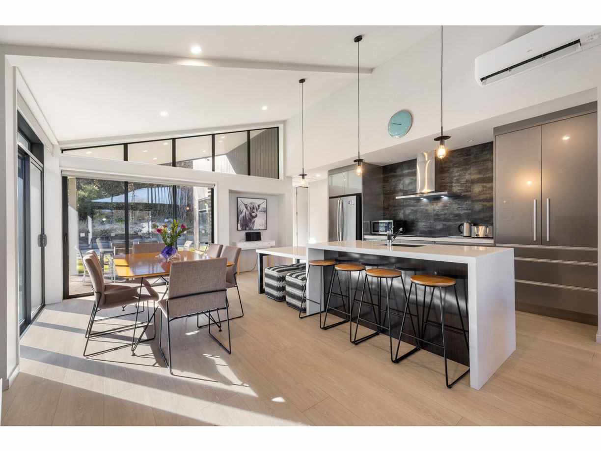 The well-appointed designer kitchen effortlessly flows into the open plan living and dining space. With ranch slider doors creating seamless indoor-outdoor flow, start your day with morning coffee mesmerized by the alpine beauty and snow capped mountains and end it with a cold beer while admiring the stunning sunset over the peaks of the Hanmer Forest Park.