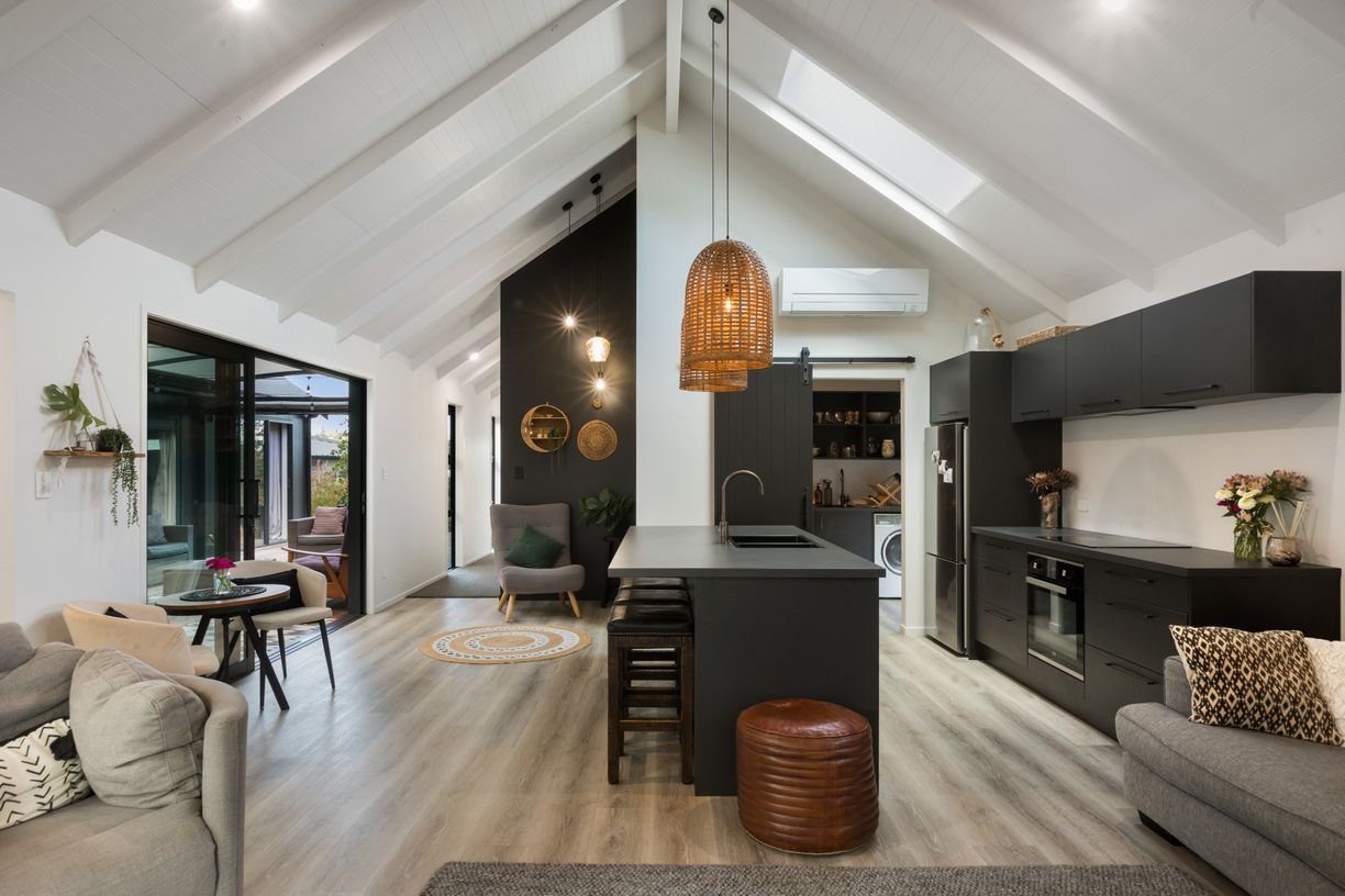 The open-plan living area exudes contemporary elegance, enhanced by soaring cathedral-style ceilings that amplify the sense of space and luxury. The impeccably designed kitchen is a masterpiece of both style and functionality, featuring modern appliances, dual sink, breakfast bar, good cupboard and bench space and a generous butler's pantry equipped with a built-in sink and abundant shelving to maintain a clutter-free environment. Comfort is ensured year-round with a heat pump, and stacker doors seamlessly extend the living space to an enclosed outdoor entertaining area, offering privacy and versatility with roll-up blinds for adjustable ambiance. The master suite is a sanctuary of sophistication, boasting an oversized walk-in wardrobe-a dream for those who appreciate organization-and direct access to the deck. An additional well-appointed bedroom in this wing includes a double built-in wardrobe. These rooms are serviced by a luxurious bathroom, complete with a double vanity, a walk-in tiled shower, a soaking tub, and a separate toilet featuring the same contemporary vanity design. On the opposite side of the home, an oversized lined garage provides ample space to accommodate 2-3 vehicles in tandem, while still allowing for a workshop area with built-in bench space. Currently utilized as an additional lounge, this versatile space presents endless possibilities-whether for extended family living, a private guest retreat, or a potential B&B setup. This section of the home also includes a self-contained bedroom with its own stylish bathroom featuring a toilet, vanity, and shower, along with direct access to the outdoor entertaining area. From start to finish, this home epitomizes contemporary luxury, with every detail meticulously considered to maximize comfort, style, and functionality.