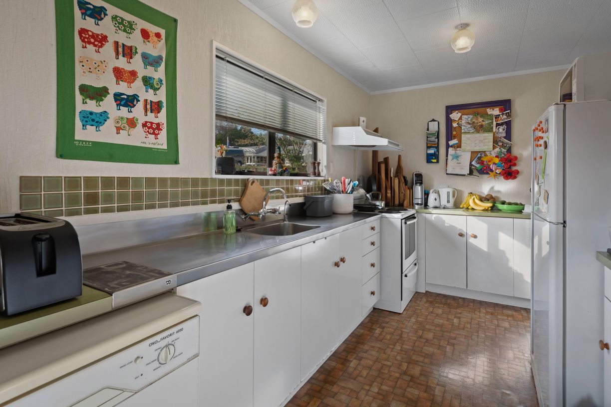 The light-filled lounge boasts high ceilings, a cozy inbuilt fire, and a heat pump for year-round comfort - all framed by tranquil views of the distant Paeroa Hills. Flowing seamlessly from the lounge, the dining area connects to a spacious galley-style kitchen - perfectly functional as-is, yet offering exciting potential for your dream renovation.