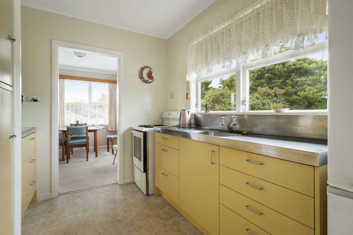 Built in the mid-1950s, the property offers a solid foundation and a practical layout, with plenty of scope to enhance and modernise to your taste. Upstairs, the kitchen enjoys views over the surrounding landscape and distant hills - a peaceful outlook that adds to the overall feel of the home. It connects through to the dining and lounge, flowing out to a front patio area - the perfect spot to sit back and take it all in.