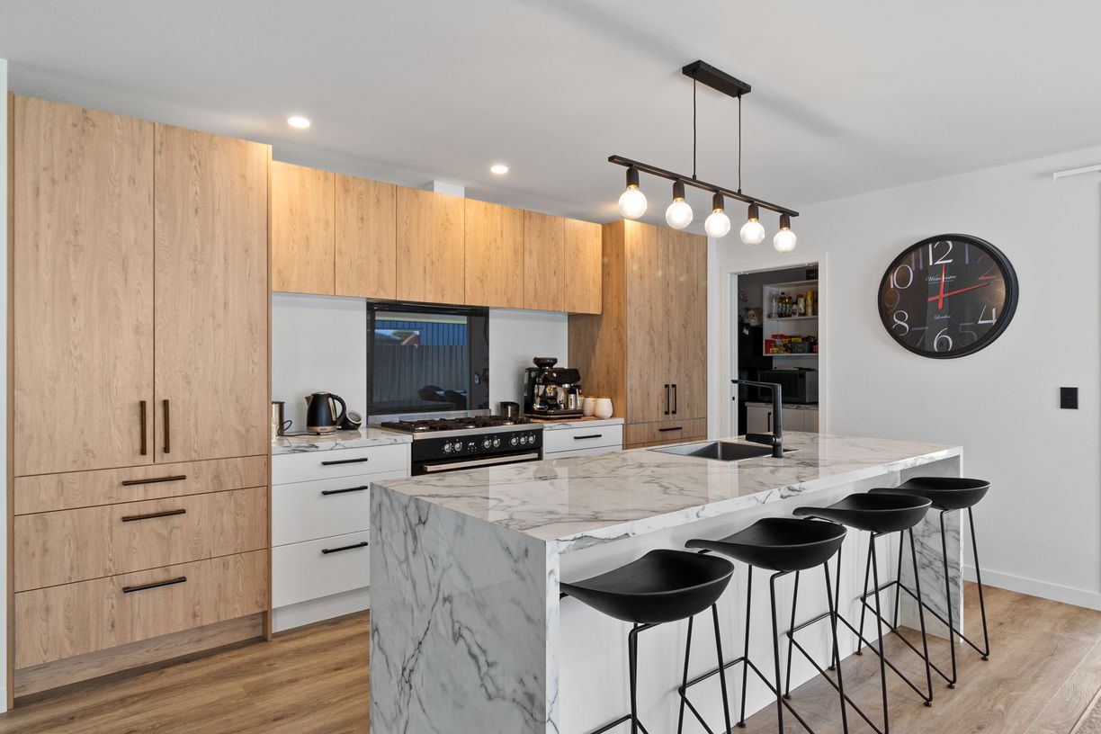 • A chef's dream kitchen with quality appliances, waterfall bench top and breakfast bar, and a huge walk-in pantry.